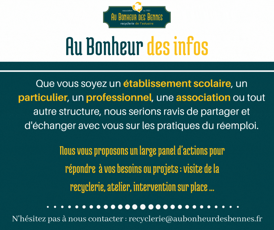 Que vous soyez un établissement scolaire, un particulier, un professionnel, une association ou tout autre structure, nous serions ravis de partager et d'échanger avec vous sur les pratiques du réemploi.